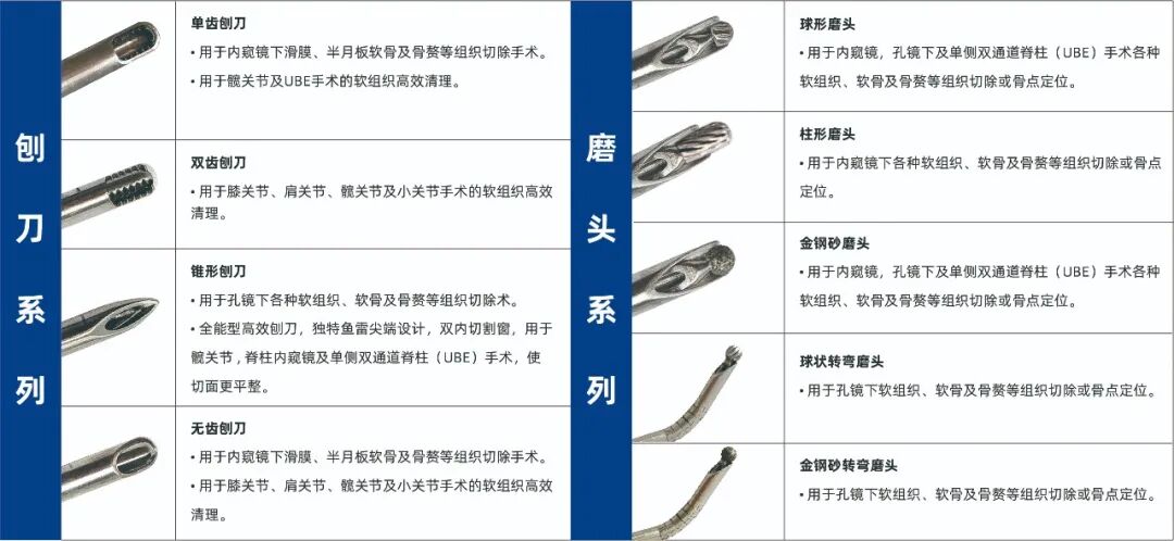 常见的刨削磨头刀刃通常分为6刃、8刃和12刃,刀刃的数量越少,切割性能就越强。直径可为3-6mm,长度76.5-126.5mm,外管大直径设计不易被堵塞,保养和维护非常简单。手术过程中刀刃锋利,对骨组织打磨力强,作用面小,定位精确。
